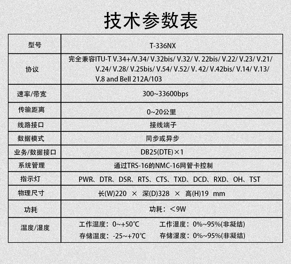 T-336NX是一款频带调制解调器,支持拨号和专线两种工作模式,通过一根电话线实现RS232串口数据和电话的远距离传输。