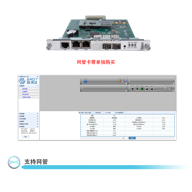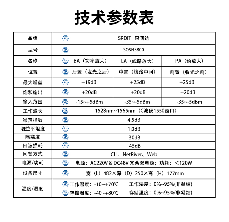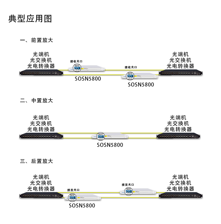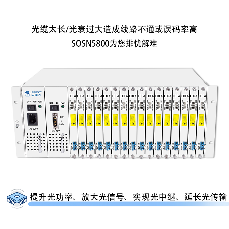 SOSN5800是一款EYDFA掺铒掺镱光纤放大器,用于数字光纤系统远距离传输。使用高可靠Pump光源,采用APC(自动功率控制)和ATC(自动温度控制)电路,稳定可靠输出高功率光信号。内置专业的GFF(增益平坦滤波器),使其平坦度与噪声都得到极好的优化,不仅适合一般的光纤传输系统和广电CATV系统,更适合DWDM波分复用系统使用。