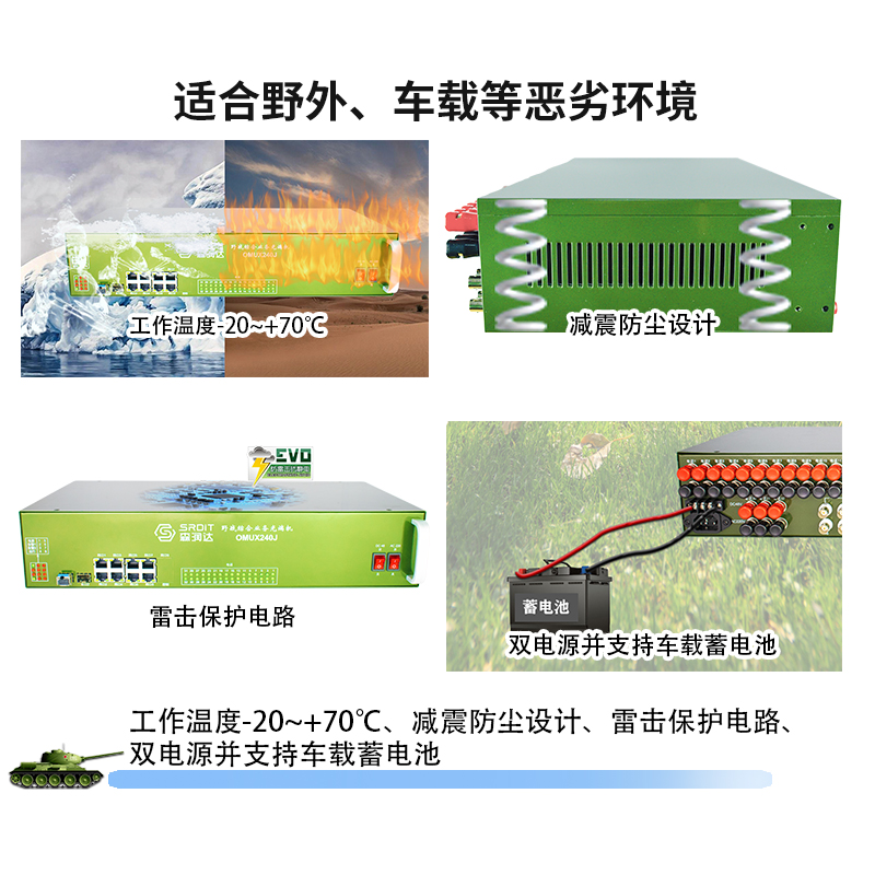 综合业务光端机OMUX240J。OMUX240J是一款野外阵地综合业务光端机,通过一根光纤实现视频、物理隔离网络、E1(2M)、自动电话/磁石电话以及RS232/RS485的远距离传输。无需设置即插即用,防雷保护稳定运行。行业应用场景:野战指挥系统、阵地指挥系统、应急指挥、驻地联网、铁路通信、企业组网。